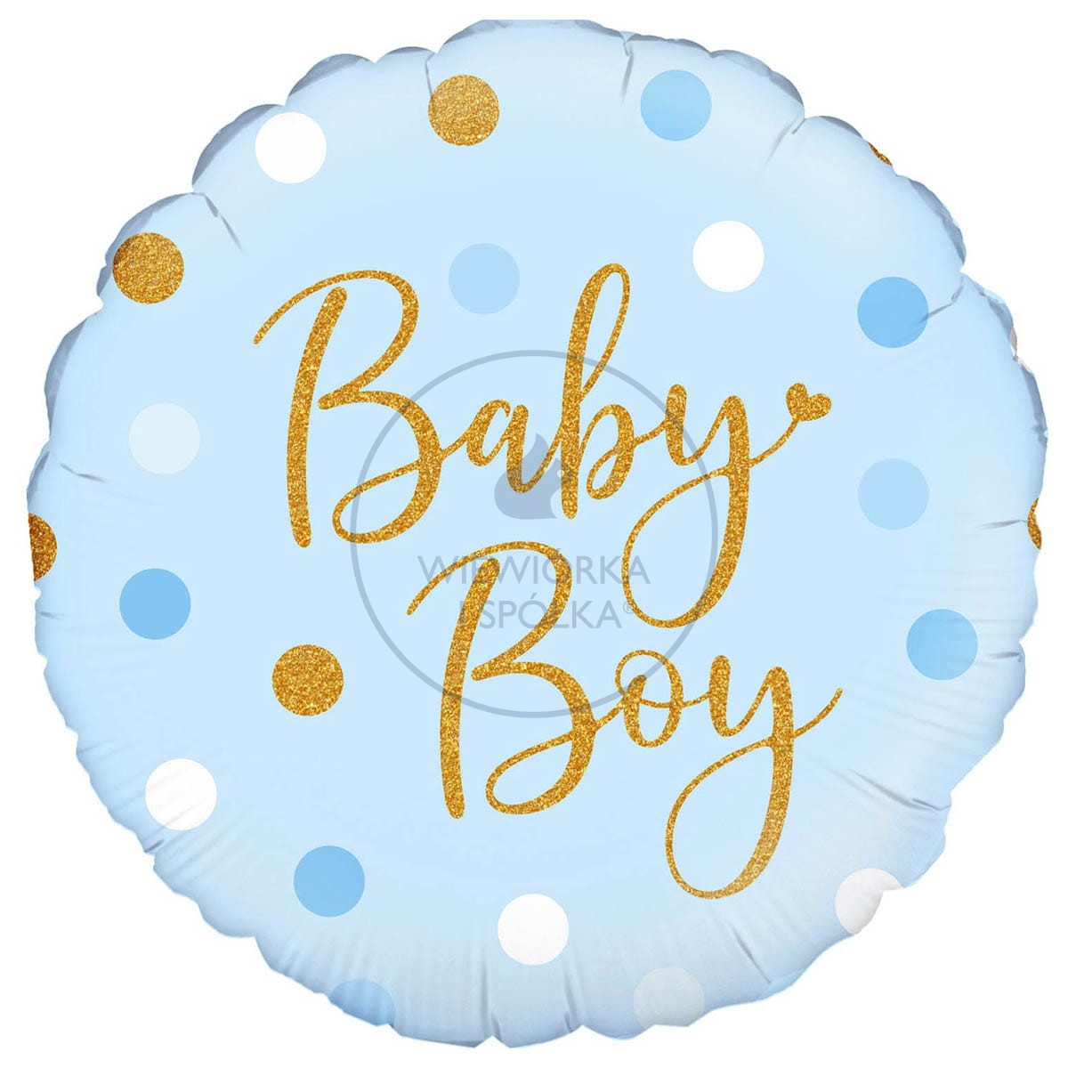 Piękny okrągły błękitny balon w białe, błękitne i złote groszki oraz ze złotym holograficznym napisem "Baby Boy".
