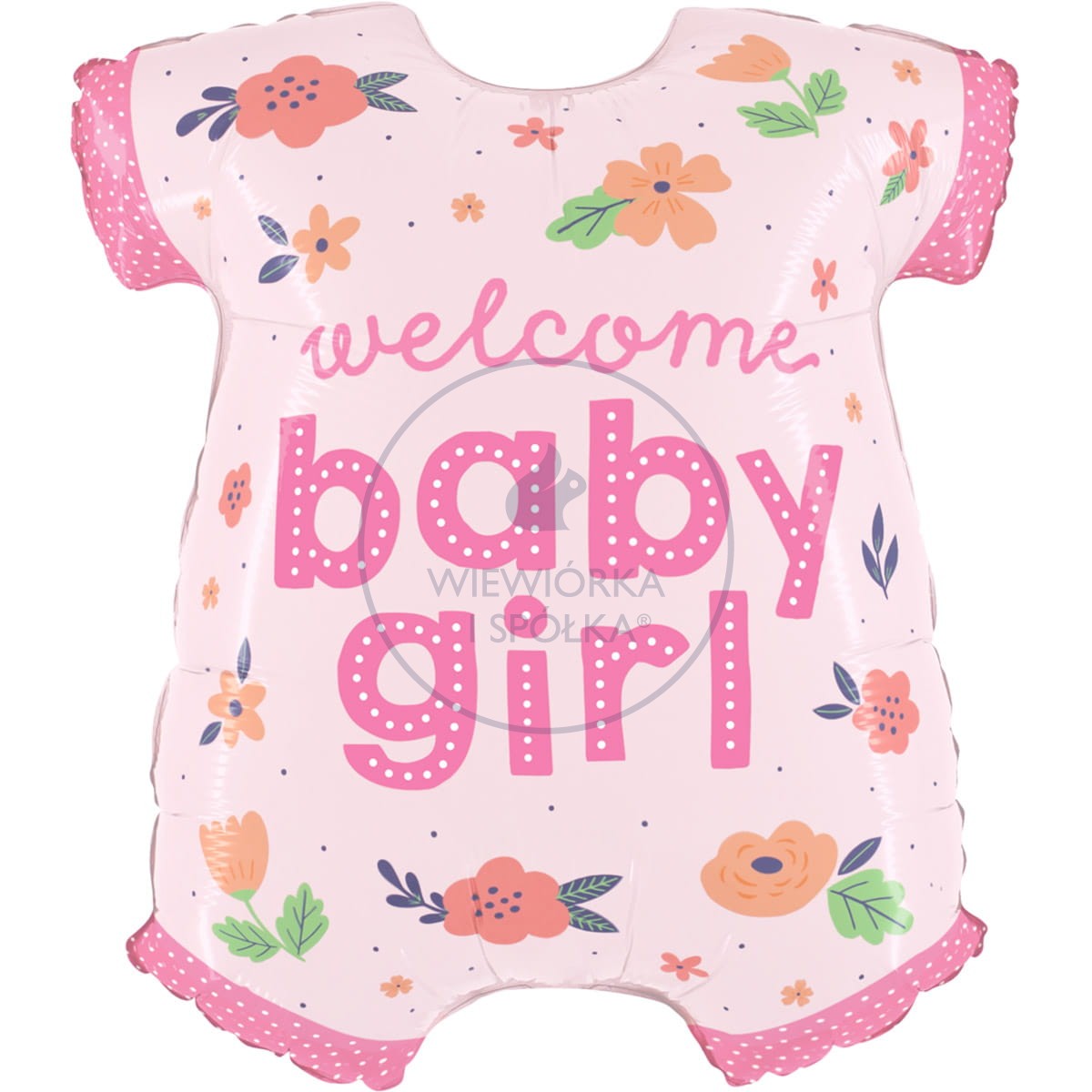 Uroczy balon w kształcie różowych śpioszków w kwiatki oraz z różowym napisem "Welcome Baby Girl".