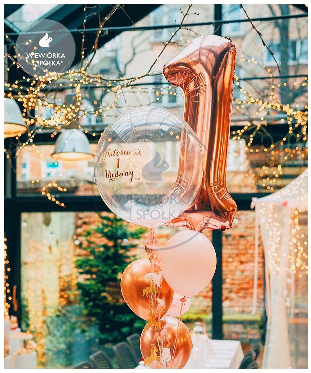 Piękny olbrzymi balon w kształcie cyfry 1 w kolorze rose gold.