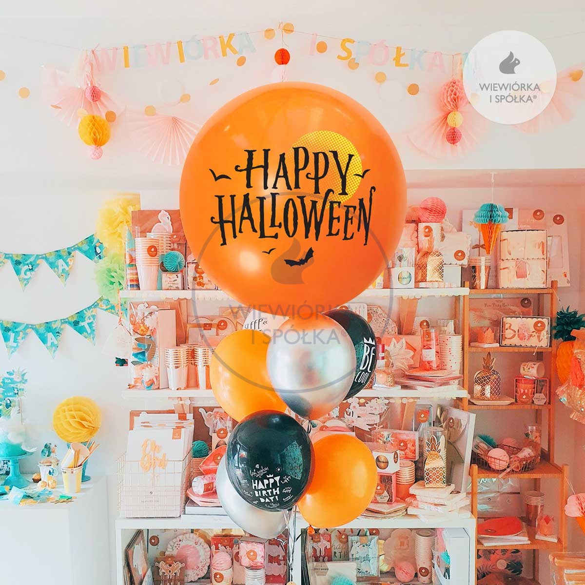 Piękny gigantyczny pomarańczowy balon o średnicy do 1 m. Z czarnym dużym napisem "HAPPY HALLOWEEN".