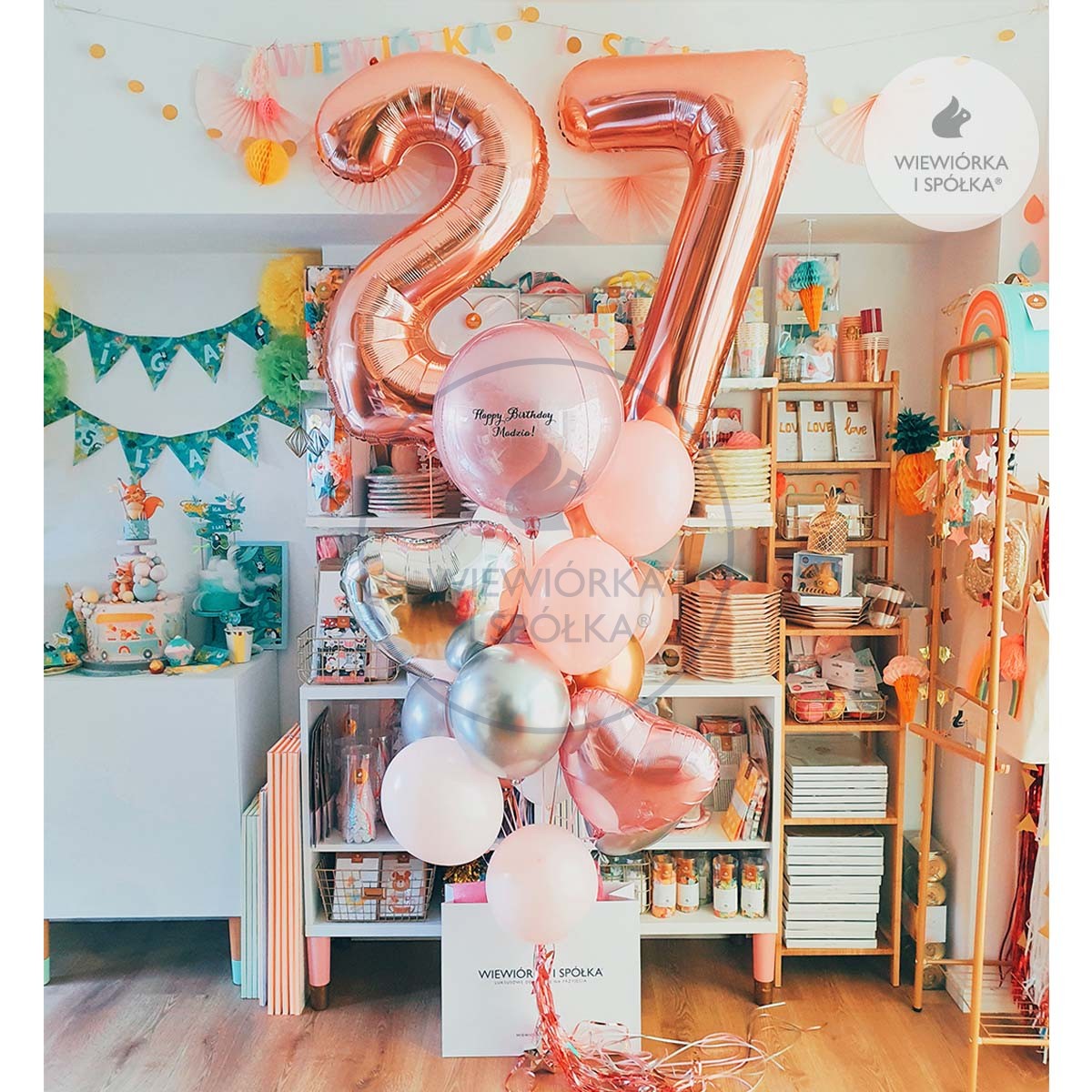 Zjawiskowy ogromny bukiet 20 sztuk balonów napełnionych helem z ozdobnymi ogonami. W bukiecie znajdują się balony cyfry olbrzymy (cyfry do wyboru), balony kształty serca, kula 3d z Twoim personalizowanym napisem oraz przepiękne balony klasyczne w kolorach pudrowego różu, srebra, łososia, złamanej bieli i rose gold.