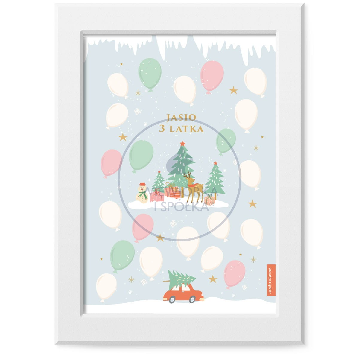 Przepiękne Drzewko Życzeń ze świątecznymi motywami jelonka, śniegu, choinki, bałwana oraz z personalizowaną treścią zaprojektowane przez Wiewiórka i Spółka.