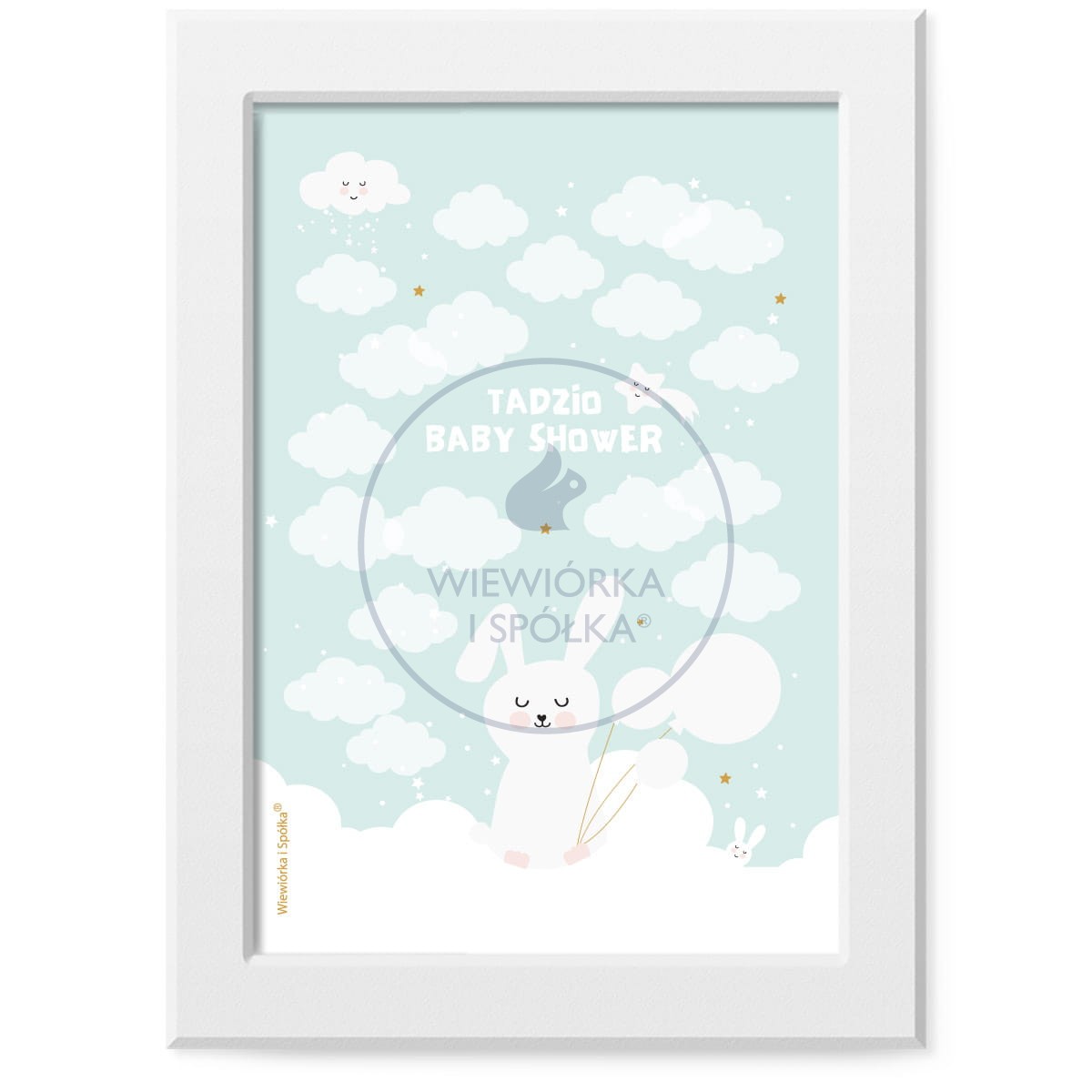 Przepiękne Drzewko Życzeń z króliczkiem, chmurkami na miętowym tle i z personalizowaną treścią zaprojektowane przez Wiewiórka i Spółka.