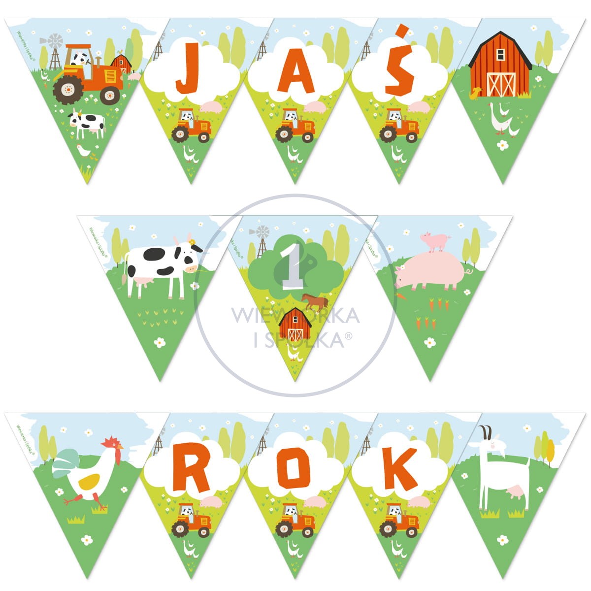 Wiejskie zwierzęta, krowa w traktorze, stodoła, a przede wszystkim Twój personalizowany napis, np. Jaś 1 rok.