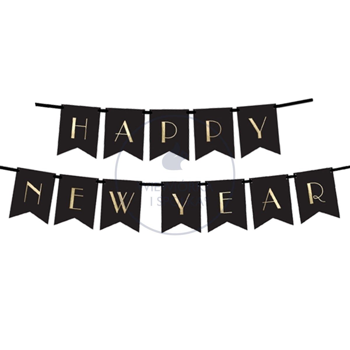 Komplet flag w kolorze głębokiej intensywnej czerni ze złotymi, połyskującymi literami tworzącymi napis "HAPPY NEW YEAR".