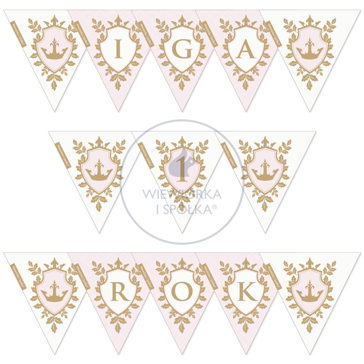 Złota korona i liście akantu na delikatnym różowym tle, a przede wszystkim Twój personalizowany napis, np. Iga 1 Rok.