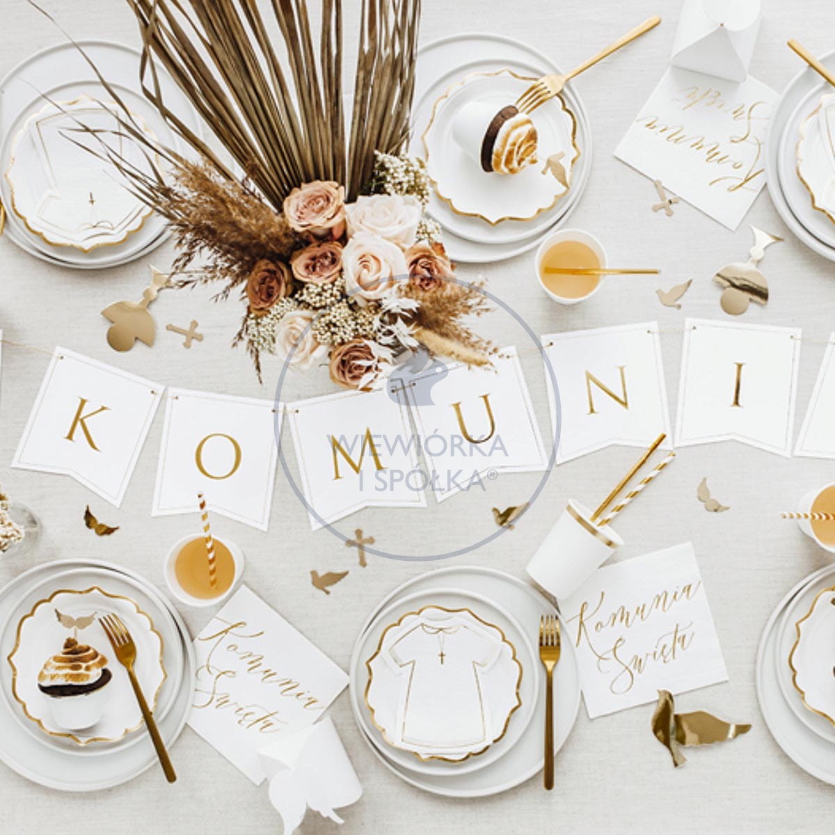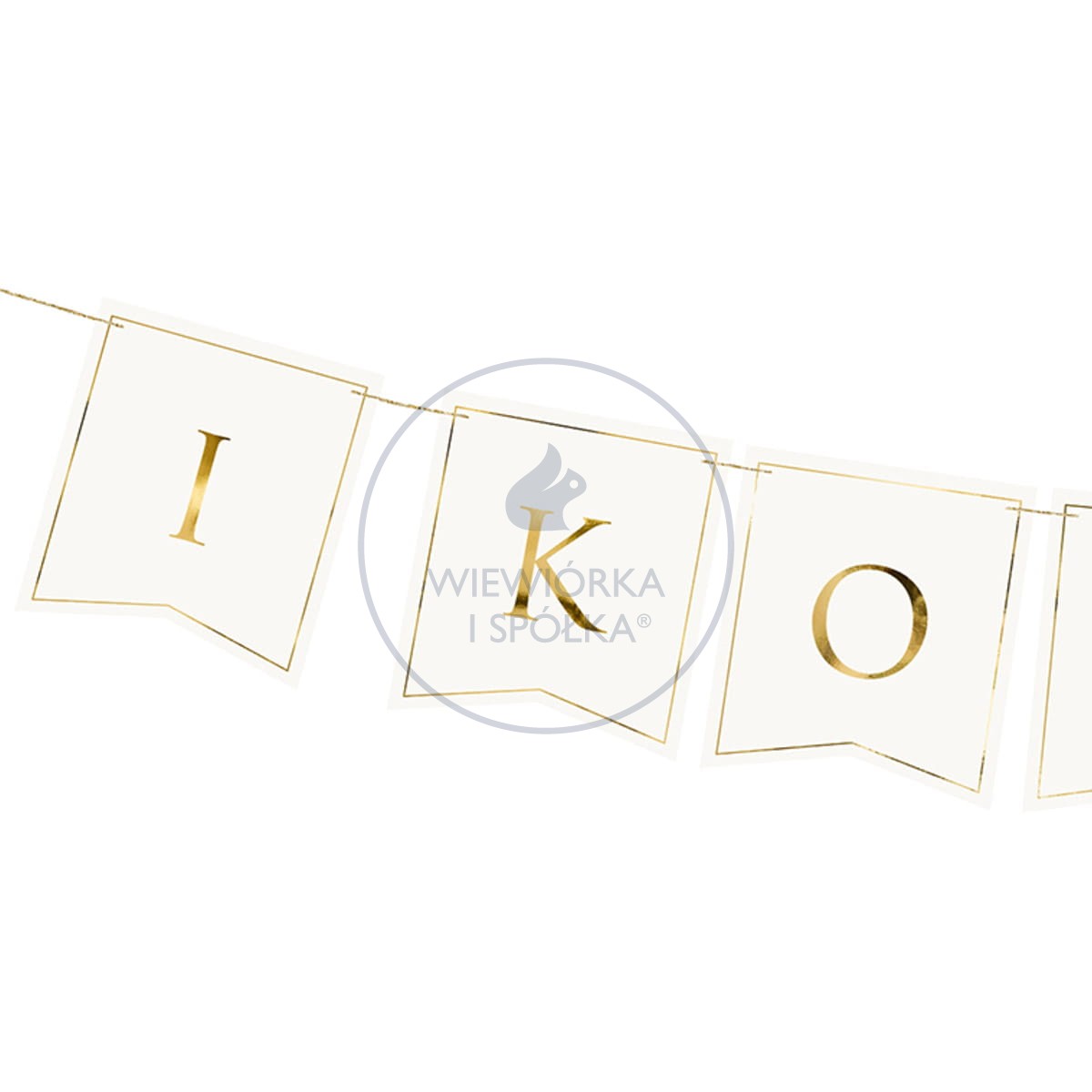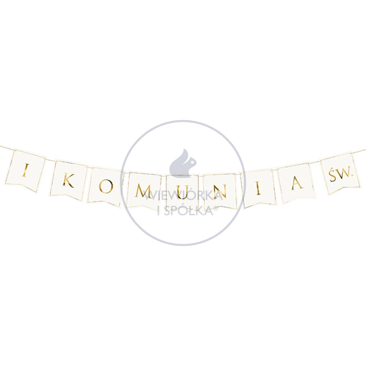 Biała papierowa girlanda ze złotymi, połyskującymi literami tworzącymi napis ”I KOMUNIA ŚW.".