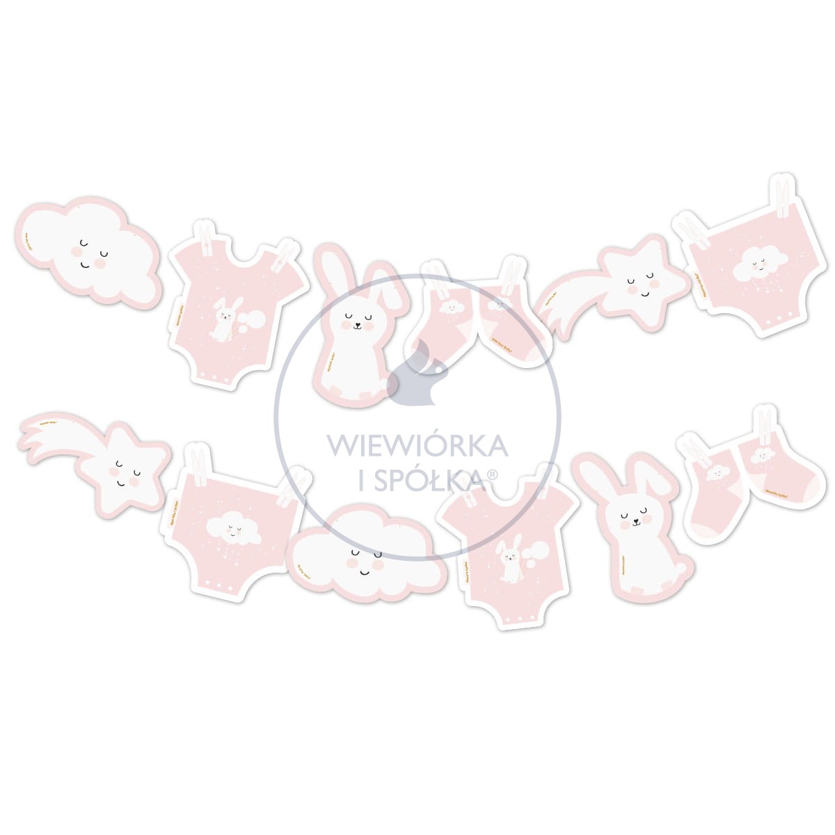 Przepiękne kształty króliczka, chmurki, gwiazdki, śpioszków i skarpetek w odcieniach różu.