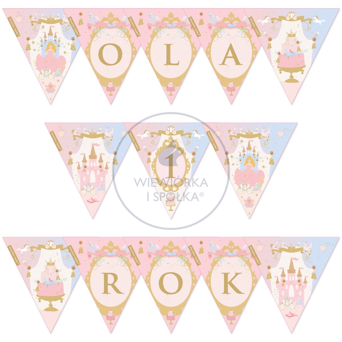 Złotowłosa księżniczka w zwiewnej sukni, wielopiętrowy tort, różowy zamek, a przede wszystkim Twój personalizowany napis, np. Ola 1 Rok.