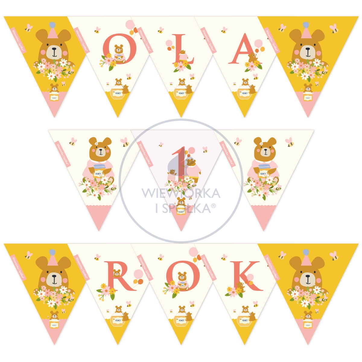 Urocze misie, pachnące kwiaty, słodki miodek i pszczoły, a przede wszystkim Twój personalizowany napis, np. Ola 1 Rok.