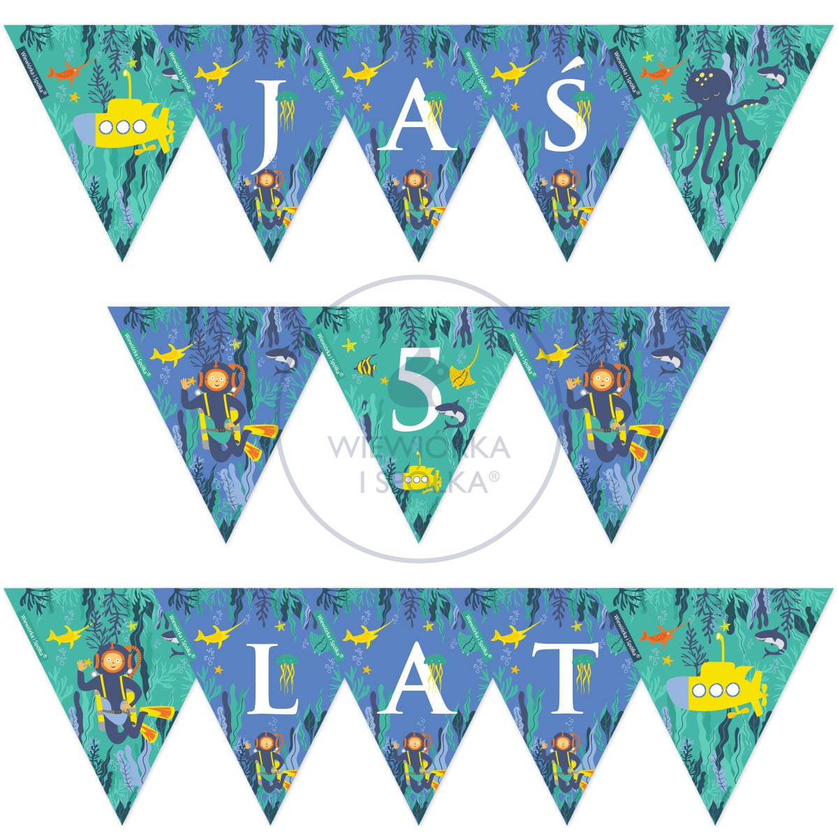 Żółta łódź podwodna, nurek, ośmiornica, rekin, ryba piła, wodorosty, a przede wszystkim Twój personalizowany napis, np. Jaś 5 lat.
