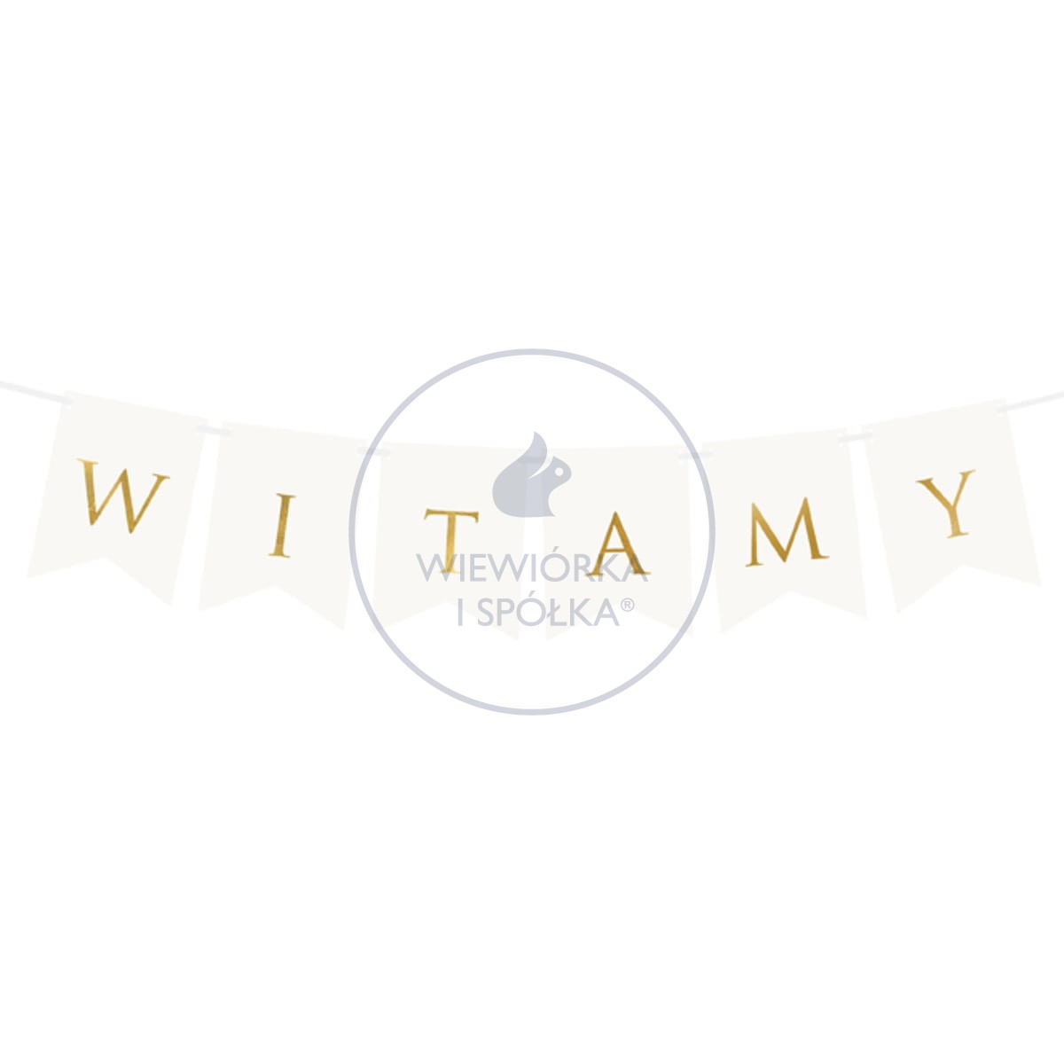 Biała girlanda ze złotymi, połyskującymi literami tworzącymi napis "Witamy".