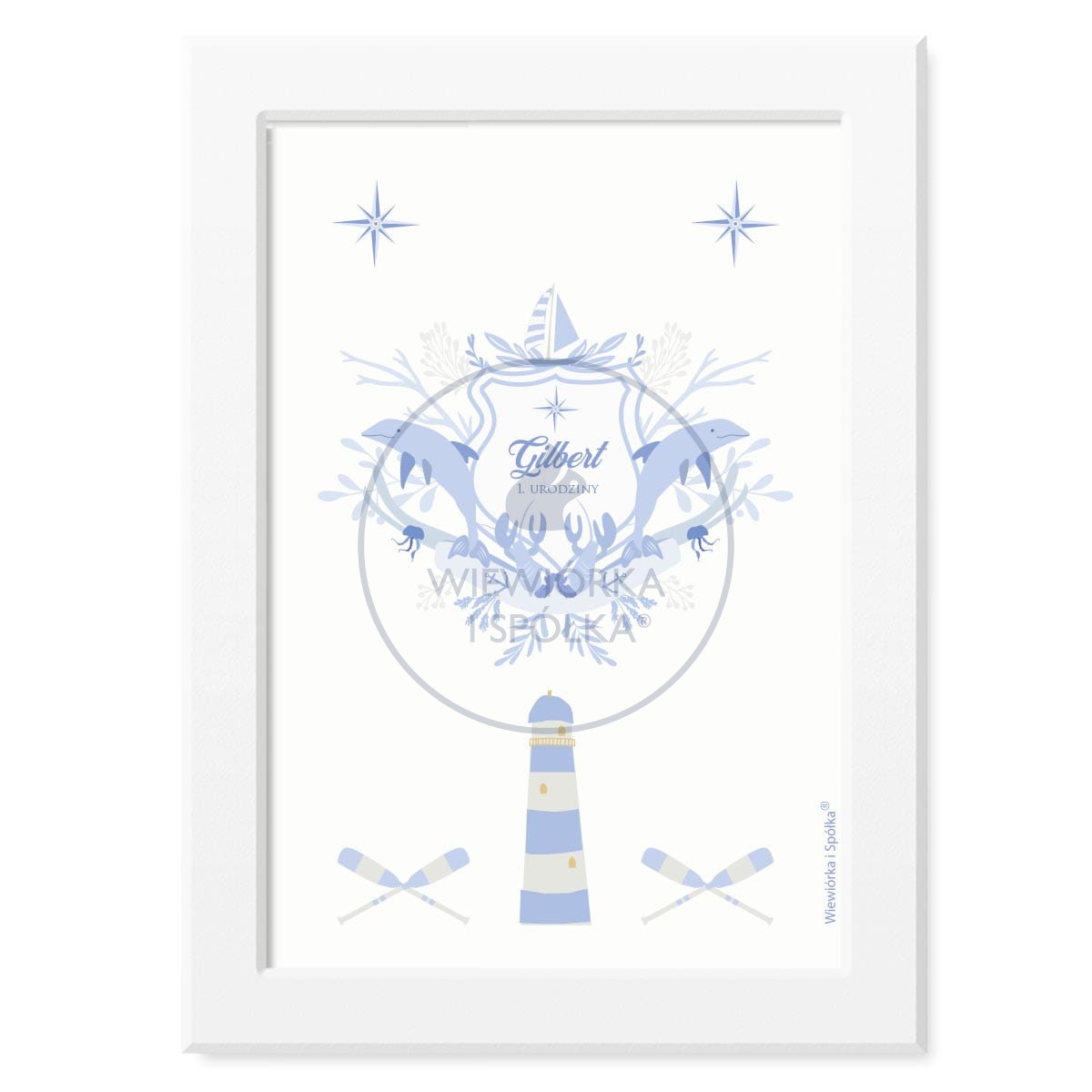 Unikatowy obraz z błękitnymi marynistycznymi wzorami, żaglówką, latarnią morską, delfinami i z personalizowaną treścią, zaprojektowany przez Wiewiórka i Spółka.