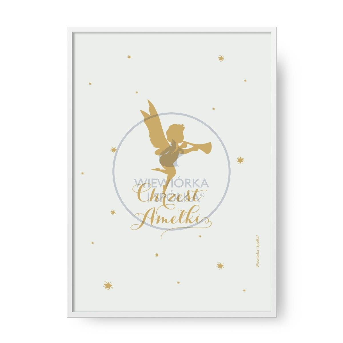 Unikatowy plakat ze złotym aniołkiem na miętowym tle oraz z personalizowanymi napisami, zaprojektowany przez Wiewiórka i Spółka.