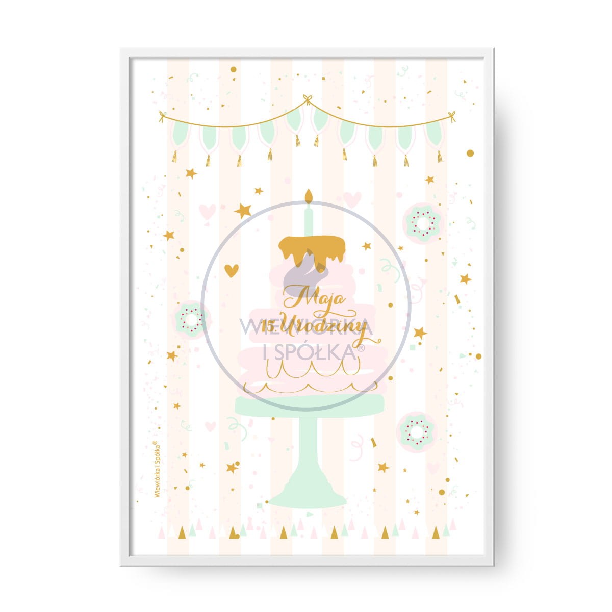 Unikatowy plakat z tortem w pastelowych kolorach i ze złotymi personalizowanymi napisami, zaprojektowany przez Wiewiórka i Spółka.