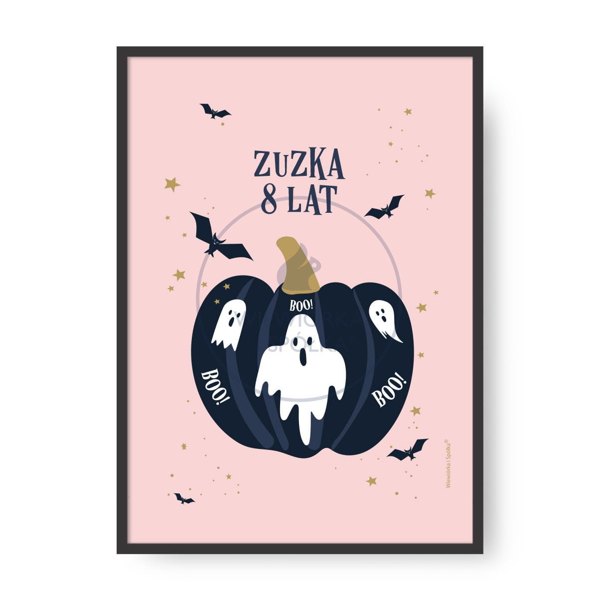 Unikatowy plakat z dynią pełną duchów na różowym tle i z personalizowanymi napisami, zaprojektowany przez Wiewiórka i Spółka.