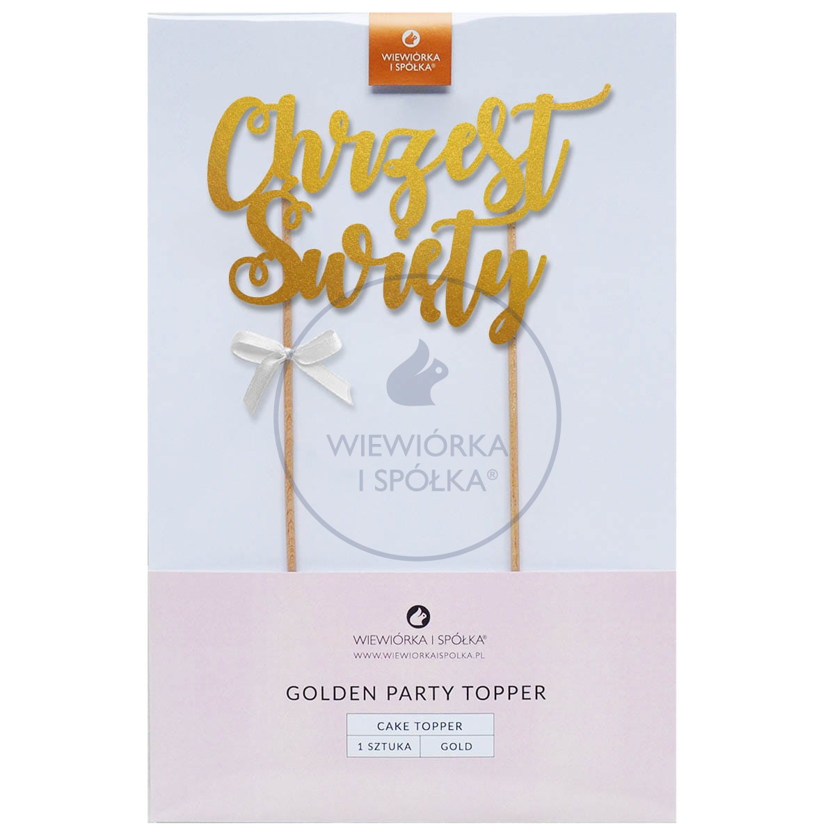 Elegancki złoty napis „Chrzest Święty" do dekoracji tortu, zaprojektowany przez Wiewiórka i Spółka.