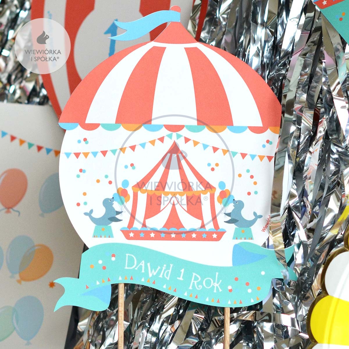 Zjawiskowy ręcznie wykonany topper na tort z cyrkiem oraz z personalizowanymi napisami, zaprojektowany przez Wiewiórka i Spółka.