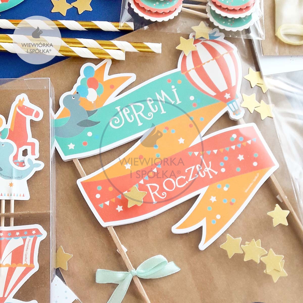 Zjawiskowy ręcznie wykonany topper na tort z cyrkowym balonem, foką oraz z personalizowanymi napisami, zaprojektowany przez Wiewiórka i Spółka.