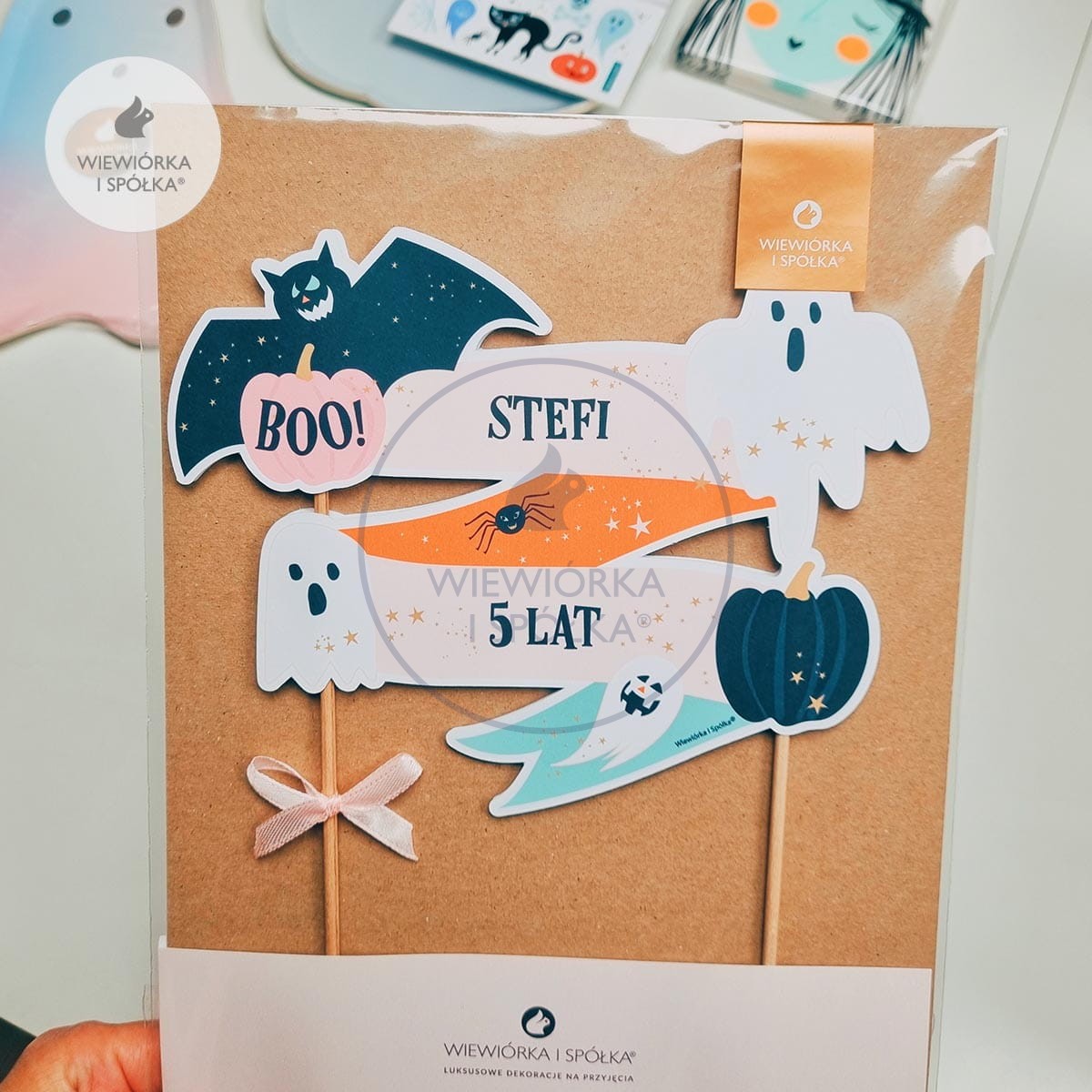 Zjawiskowy ręcznie wykonany topper na tort z duchami, dyniami, pająkiem i nietoperzem oraz z personalizowanymi napisami, zaprojektowany przez Wiewiórka i Spółka.