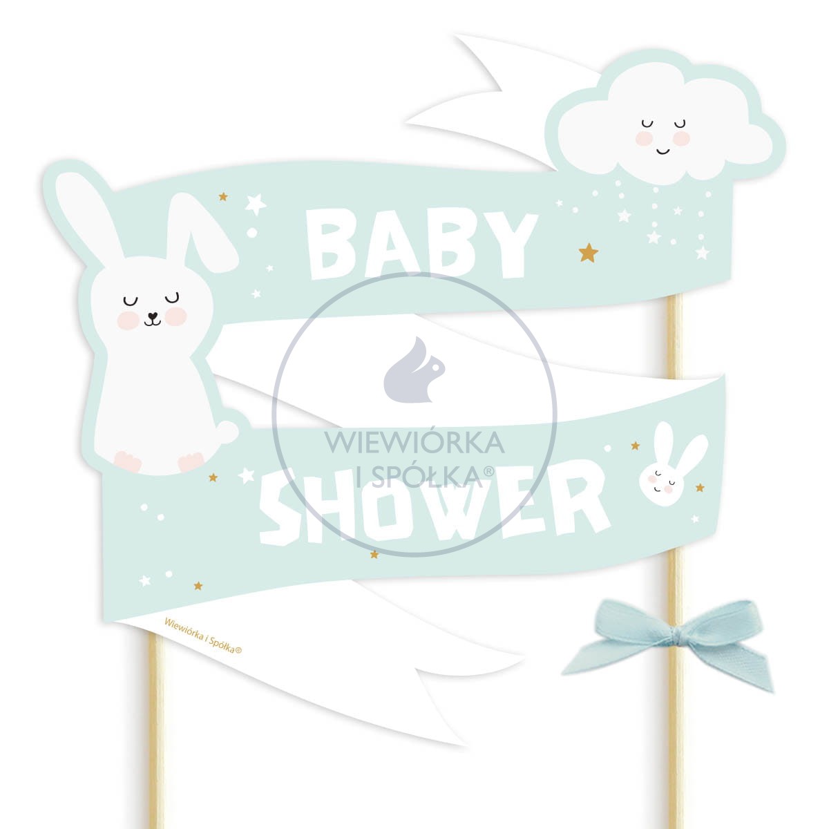 Zjawiskowy ręcznie wykonany topper na tort z króliczkiem i chmurką na miętowym tle oraz z napisem Baby Shower, zaprojektowany przez Wiewiórka i Spółka.
