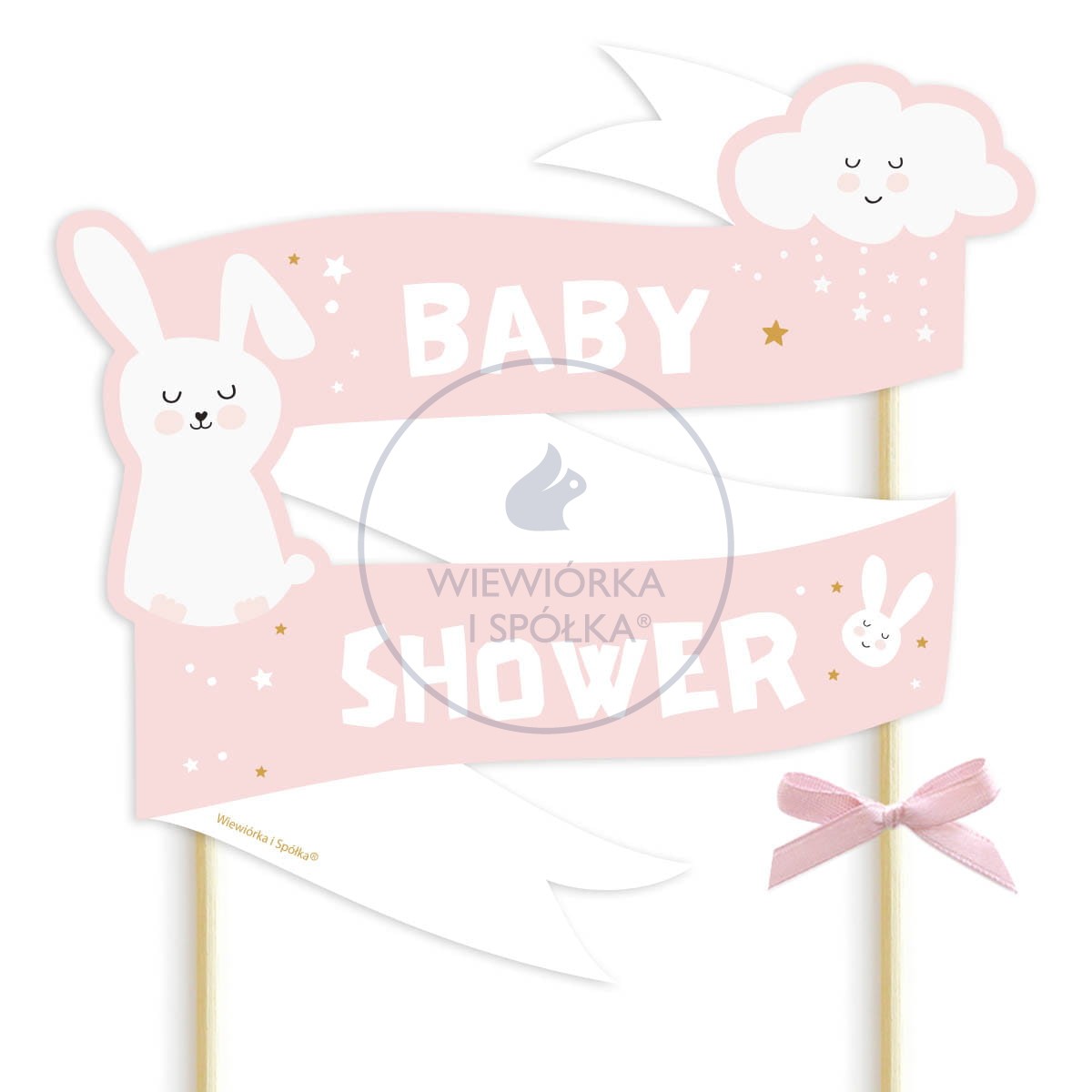 Zjawiskowy ręcznie wykonany topper na tort z króliczkiem i chmurką na różowym tle oraz z napisem Baby Shower, zaprojektowany przez Wiewiórka i Spółka.